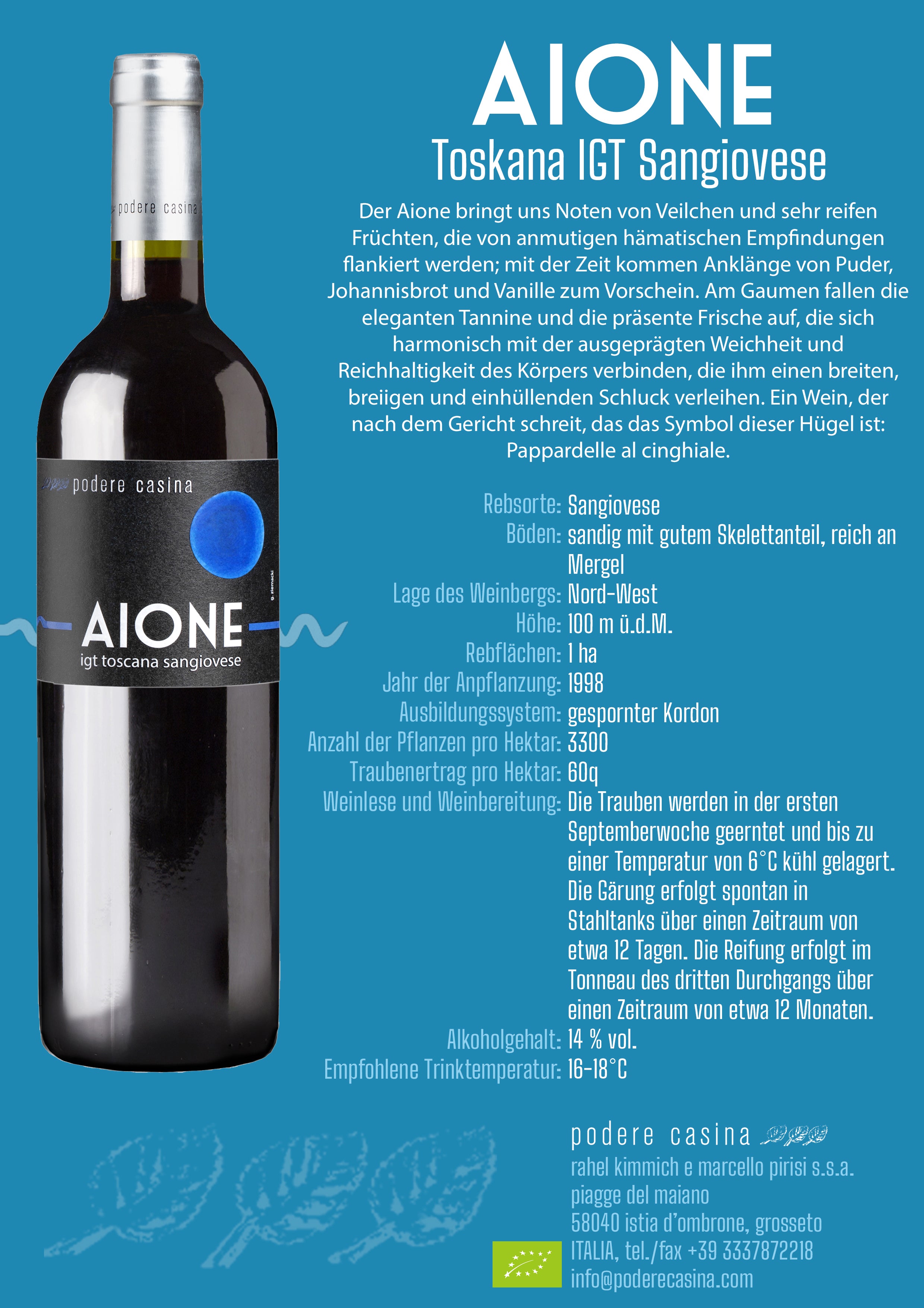 Der Aione bringt uns Noten von Veilchen und sehr reifen Früchten, die von anmutigen hämatischen Empfindungen flankiert werden; mit der Zeit kommen Anklänge von Puder, Johannisbrot und Vanille zum Vorschein. Am Gaumen fallen die eleganten Tannine und die präsente Frische auf, die sich harmonisch mit der ausgeprägten Weichheit und Reichhaltigkeit des Körpers verbinden, die ihm einen breiten, breiigen und einhüllenden Schluck verleihen. Ein Wein, der nach dem Gericht schreit, das das Symbol dieser Hügel ist: