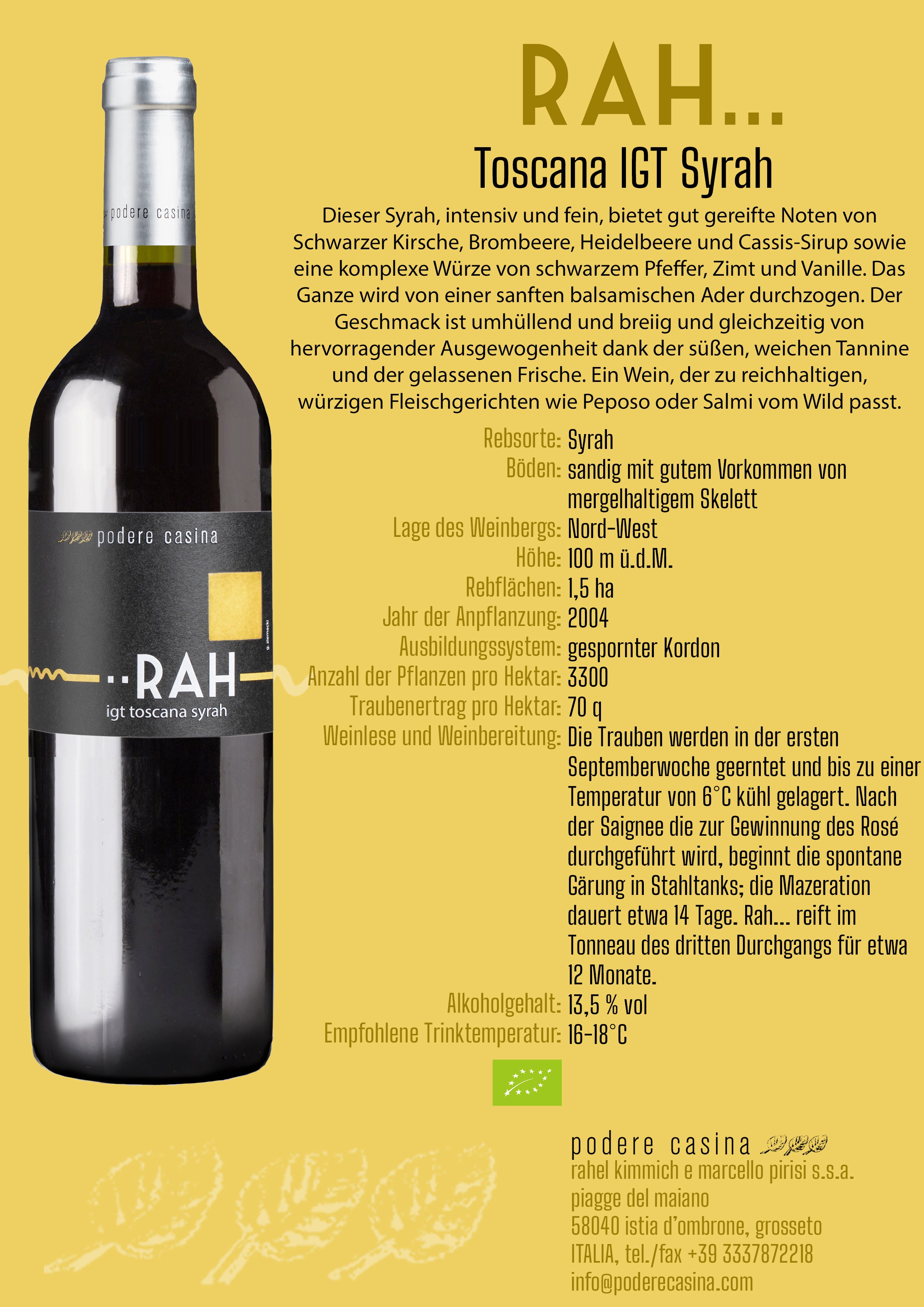 Dieser Syrah zeigt sich verführerisch intensiv und zugleich von feiner Noblesse. Reife Aromen von schwarzer Kirsche, saftiger Brombeere, dunkler Heidelbeere und einem Hauch Cassis-Sirup entfalten sich mit sinnlicher Tiefe, begleitet von einer raffinierten Würze aus schwarzem Pfeffer, Zimt und zarter Vanille. Eine sanfte balsamische Note zieht sich wie ein leiser Atem durch das Aromenspiel. Am Gaumen umschmeichelt er weich und voll, bleibt dabei wunderbar ausbalanciert – getragen von süßen, seidigen Tanninen und einer ruhigen, eleganten Frische. Ein Wein, der sich genussvoll zu kräftigen, würzigen Fleischgerichten hingibt, etwa zu Peposo oder aromatischem Wildsalmi.![]() |